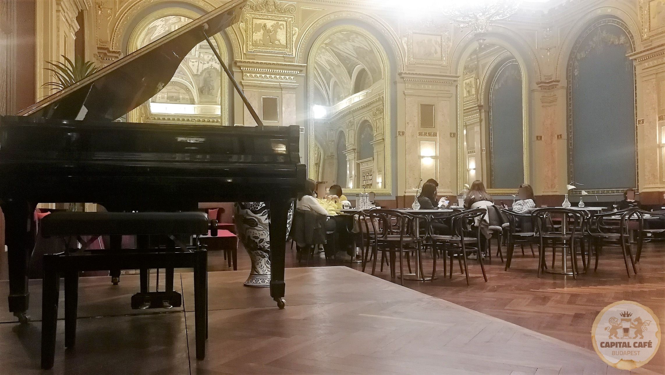 A felújítás valóban autentikusan sikerült, és maga a terem lenyűgöző látványt nyújt. A háttérben szóló kellemes zene is illeszkedik a hely szelleméhez, bár ha beszélgetni is szeretnének, akkor javaslom, hogy ne közvetlenül az ablaknál lévő asztalokat válasszák, mert ott zavaróan hangos a zene.
